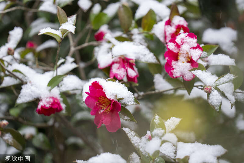 其实,岂止是在梵行寺,冬日里的长江南北,人们总是能在这里或那里,见到一簇簇“灿红如火雪中开”的山茶。这些灿红的花朵,掩映在飞舞的雪片之中,美艳而浓烈。它们金黄色的花蕊灼灼耀目,墨绿色的叶子在雨雪中显得愈加精神。