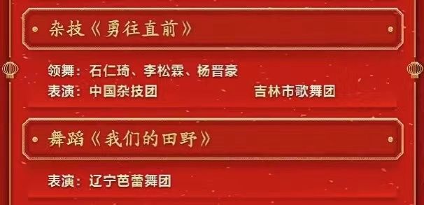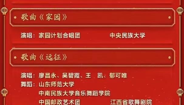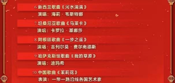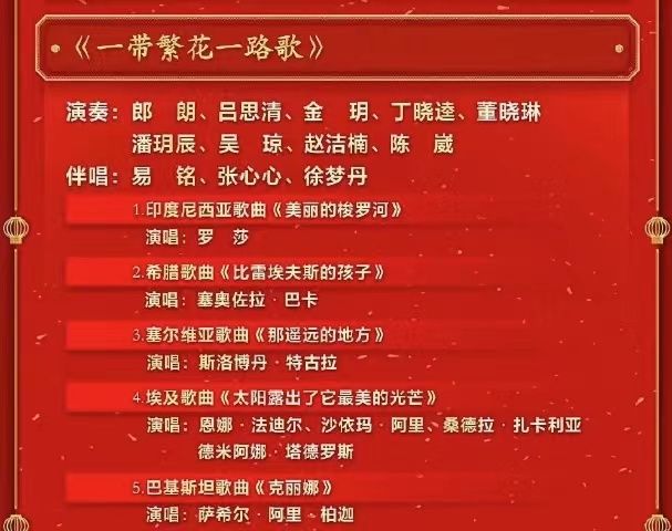 节目单中,歌舞类节目既有质朴真情的舒心曲,也有清新雅致的“田园诗”。《远征》《未来我来》《青春向太阳》等歌曲高亢悠扬,给人以力量;《一带繁花一路歌》以国际化的元素,展现文明交流互鉴带给各国人民的喜悦与欢欣;《开饭!开FUN!》《好运全都来》《新春蹦蹦》年味十足,朗朗上口。