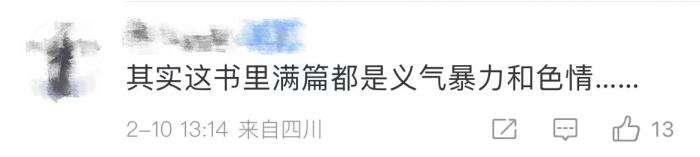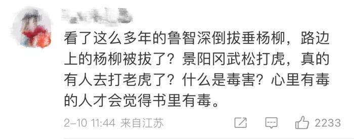 这位网民同时表示,《武松打虎》等两三篇课文确实好,但原书中武松、晁盖之流却是彻头彻尾的人渣。文笔好的小说多的是,不需要从毒小说中找课文素材。更要禁止任何学校向学生推荐水浒做课外读物。