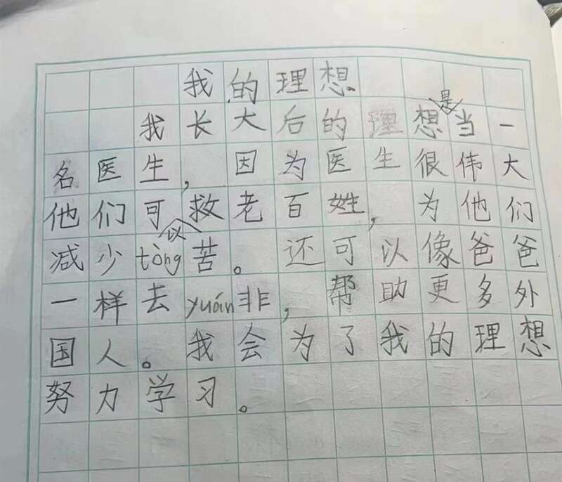 郭建伟的儿子刚刚9岁,用汉字和拼音组合写了一篇题为《我的理想》的作文。孩子在文中说,希望长大后当一名医生,像爸爸一样援非,帮助更多的人。
