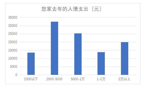 问卷结果显示,在所有问卷地区中,去年家庭人情支出为2000元以下的占比为12.88%,居于2000-5000元区间的占比为30.88%,居于5000-1万元区间的占比为24.07%,居于1-2万元区间的占比为13.20%,超过2万元的占比为18.97%。