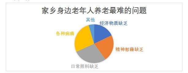 28%的问卷认为家乡身边老年人养老最难的问题是日常照料缺乏,27%的问卷认为家乡身边老年人养老最难的问题是各种病痛,22%的问卷认为家乡身边老年人养老最难的问题是精神慰藉缺乏,18%的问卷认为家乡身边老年人养老最难的问题是经济物质缺乏。