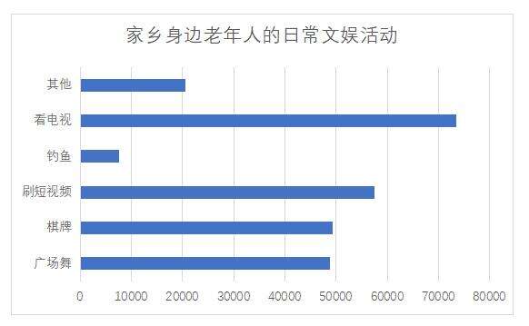 46.54%的问卷认为家乡身边老年人的日常文娱活动为广场舞,47.00%的问卷认为家乡身边老年人的日常文娱活动为棋牌,54.81%的问卷认为家乡身边老年人的日常文娱活动为刷短视频,7.28%的问卷认为家乡身边老年人的日常文娱活动为钓鱼,70.03%的问卷认为家乡身边老年人的日常文娱活动为看电视。