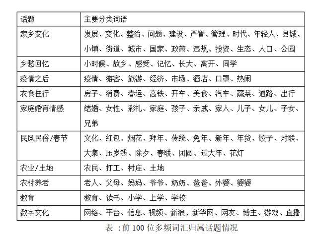 对4593条优质博文选择名词大类和动词大类进行分词整理和新词挖掘,并在此基础上基于出现词语的频数和微博条数进行统计,筛选出前100个高频词汇(见相关词云图),再根据该高频词的网络关系进行话题归类,最后概括出如下十个热点话题。它们分别是:家乡变化、乡愁回忆、疫情之后、衣食住行、家庭婚育情感、民风民俗、农业/土地、农村养老、教育、数字文化。