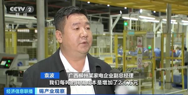 广西柳州某家电企业副总经理 袁波:我们每个月的基础用锡量大概在3.5吨左右。三个月以来,我们用锡的成本每吨增加了2.5万元。
