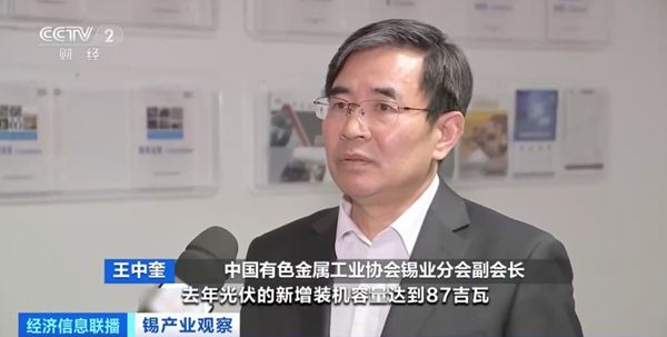 中国有色金属工业协会锡业分会副会长 王中奎:光伏和新能源汽车,还有风电各方面都会用到锡,去年光伏的新增装机容量达到87吉瓦,可能带来锡的消费量有1万多吨。