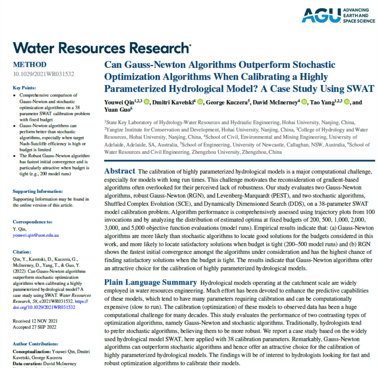 日前,我校水文院青年教师秦友伟副教授联合澳大利亚阿德莱德大学、澳大利亚纽卡斯尔大学、郑州大学等单位在水文水资源领域TOP期刊《Water Resources Research》上连续发表了包括“Can Gauss-Newton Algorithms Outperform Stochastic Optimization Algorithms When Calibrating a Highly Parameterized Hydrological Model? A Case Study Using SWAT”在内的多篇水文模型参数优化方法相关的学术论文。