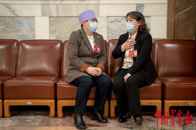 3月10日上午,北京人民大会堂,两位来自基层的全国人大代表马慧娟(左)和李翠利在场外交谈。中青报·中青网记者 李隽辉/摄