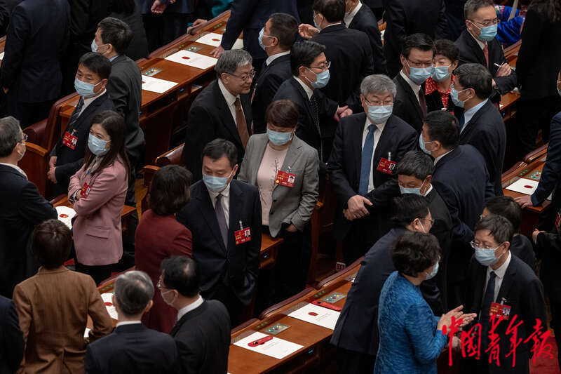 3月10日上午,北京人民大会堂,十四届全国人大一次会议第三次全体会议上,投票结束后,代表们在会场交流。中青报·中青网记者 李隽辉/摄