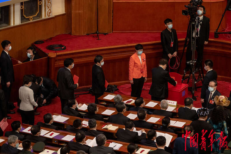 3月10日上午,北京人民大会堂,十四届全国人大一次会议第三次全体会议上,代表们依次将选票投入票箱中。中青报·中青网记者 李隽辉/摄