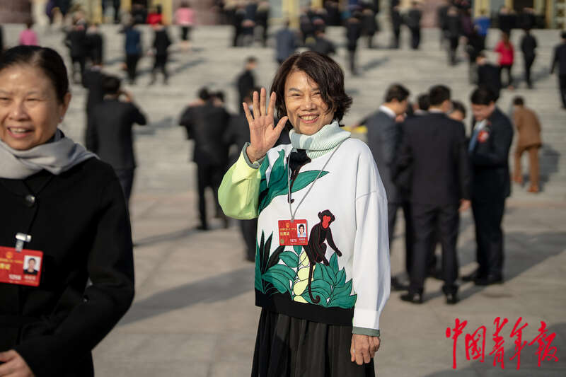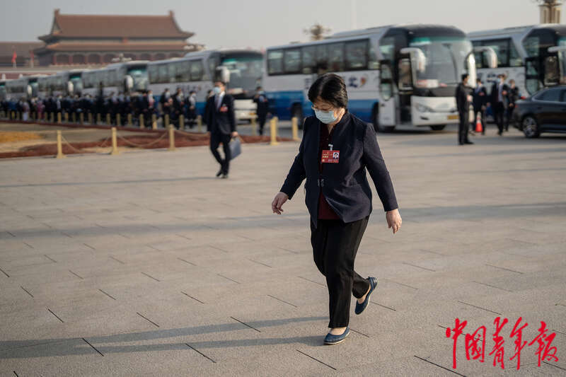 3月10日上午,北京,人民大会堂外,全国人大代表、作家、编剧赵冬苓步入会场。中青报·中青网记者 李隽辉/摄