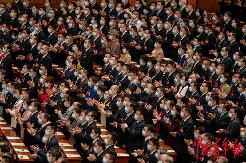 3月10日,北京人民大会堂,十四届全国人大一次会议第三次全体会议上,选举结果公布后,代表们起立鼓掌。中青报·中青网记者李隽辉/摄