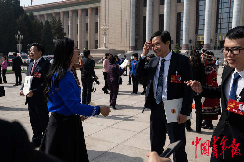 3月10日上午,北京,全国人大代表,小米集团创始人、董事长兼CEO雷军(前排右二)在人民大会堂外与其他代表交流。中青报·中青网记者 李隽辉/摄