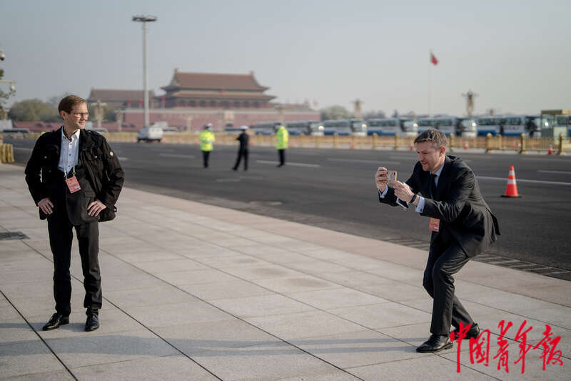 3月10日上午,北京,乌克兰驻华使节(右)和德国驻华使节在人民大会堂外拍照。中青报·中青网记者 李隽辉/摄