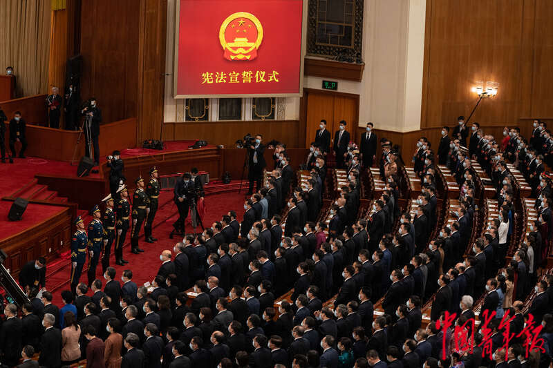 3月10日,中华人民共和国第十四届全国人民代表大会第一次会议宪法宣誓仪式在北京人民大会堂举行。当日上午9时,十四届全国人大一次会议在人民大会堂举行第三次全体会议,表决关于国务院机构改革方案的决定草案,表决第十四届全国人大一次会议选举和决定任命的办法草案,表决总监票人、监票人名单草案,选举中华人民共和国主席,选举中华人民共和国中央军事委员会主席,选举第十四届全国人大常委会委员长、副委员长、秘书长,选举中华人民共和国副主席。中青报·中青网记者 李隽辉/摄