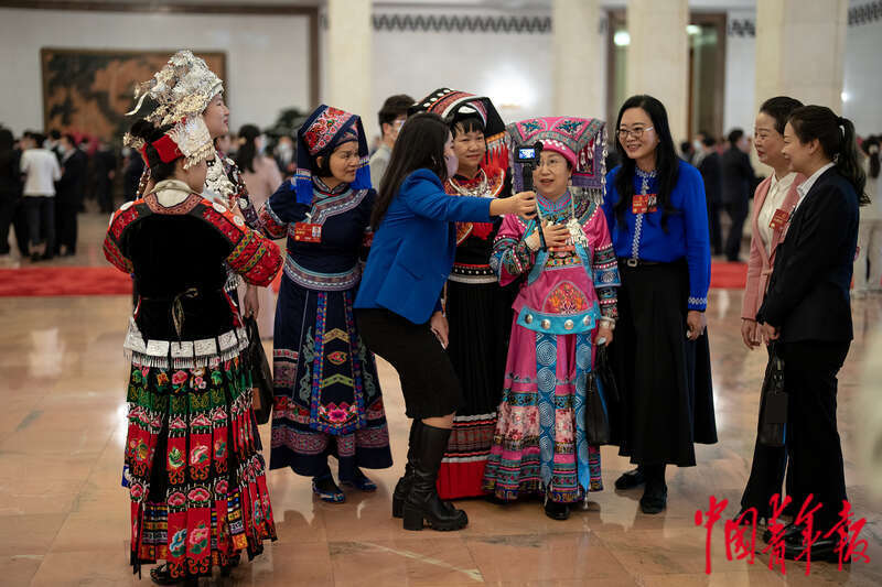 3月10日上午,北京人民大会堂,身着民族服饰的贵州代表团各代表接受媒体采访。中青报·中青网记者 李隽辉/摄