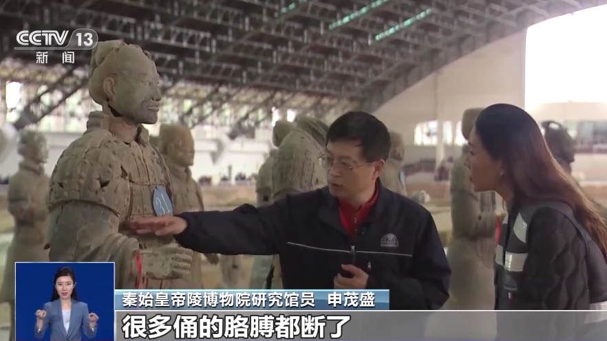 秦始皇帝陵博物院研究馆员申茂盛:我们在发掘的过程中注意到,很多俑的胳膊都断了。有古人粘接的痕迹。为什么这么做?先做出大型之后就开始雕刻细部的铠甲,铠甲雕刻好之后再装胳膊,所以下面的铠甲就能够做出来。