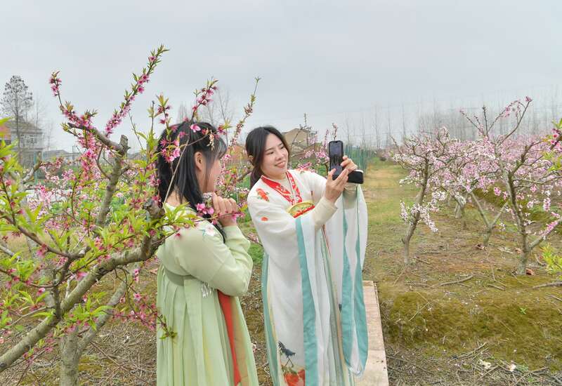 盛开的桃园吸引大学生身着汉服前来参观游玩。 仙桃市桃树研究所供图