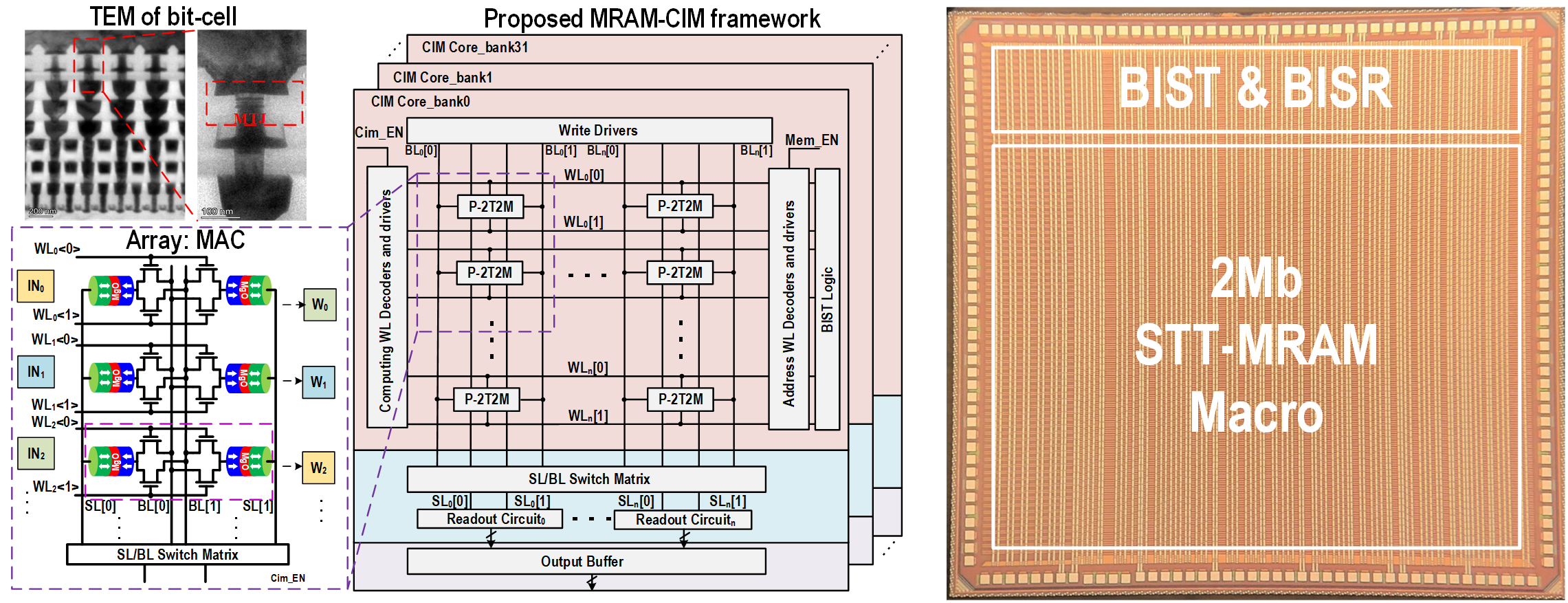 该工作以《A 28nm 2Mb STT-MRAM Computing-in-Memory Macro with a Refined Bit-Cell and 22.4 – 41.5 TOPS/W for AI Inference》为题,文章第一作者为东南大学集成电路学院蔡浩副教授。