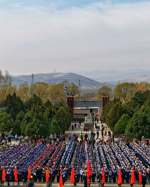 4月1日,宁夏固原,弘文中学初中部学生,凌晨4点出发,徒步54公里,到彭阳县任山河革命烈士陵园扫墓,深情缅怀革命先烈的光荣革命精神。