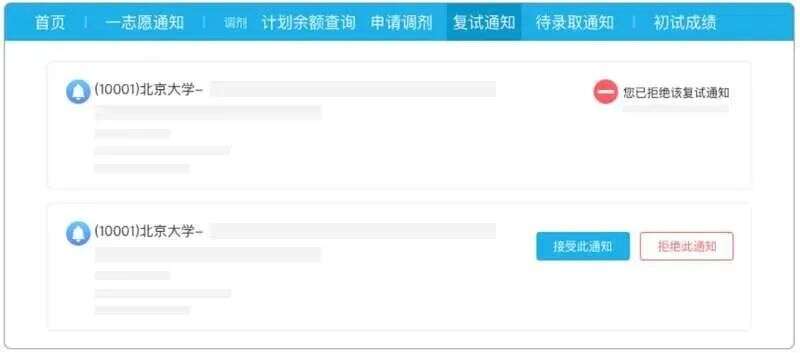 考生提交调剂志愿后,如招生单位同意其参加复试,将通过调剂系统发送复试通知。请考生及时登录调剂系统,查看志愿状态和招生单位复试通知。如果收到复试通知,请考生及时通过调剂系统在招生单位规定时间内回复是否同意参加复试,并按招生单位要求办理相关手续。