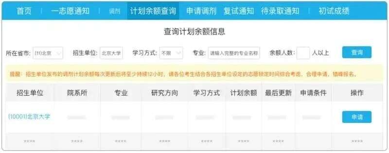 特别注意:申请调剂的考生应符合招生管理规定确定的调剂条件。不符合调入专业学科门类要求、初试科目要求,或不满足招生单位调剂条件的考生,将无法申请填报相应志愿。