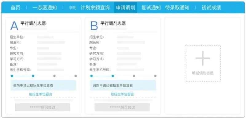 通过调剂系统选择已发布余额的招生单位和专业研究方向,如满足教育部调剂政策且符合招生单位设置的调剂报考条件,可填报调剂志愿(可一次填报三个平行调剂志愿)。提交后的调剂志愿在招生单位设置的时间内(不超过36小时)不允许修改(每个志愿单独计时),以供招生单位下载志愿信息和决定是否通知考生参加复试。锁定时间到达后,考生可继续等待或改报其他志愿。