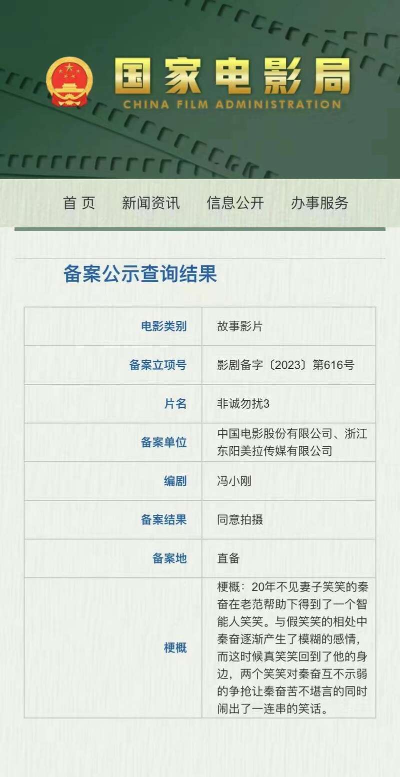 冯小刚导演的电影《非诚勿扰3》目前已备案,将于不久后开拍。