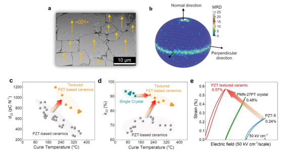 图1.a,PZT织构陶瓷的截面扫描电镜图;b,PZT织构陶瓷同步辐射XRD{002}极图;c, PZT基织构陶瓷和传统PZT基陶瓷的压电系数d 33与居里温度的关系;d, PZT基织构陶瓷和传统PZT基陶瓷的机电耦合系数k 33与居里温度的关系;e, PZT陶瓷织构、<001>晶向PMN–27PT单晶以及商用PZT-5陶瓷的电致应变对比图。