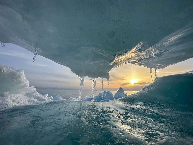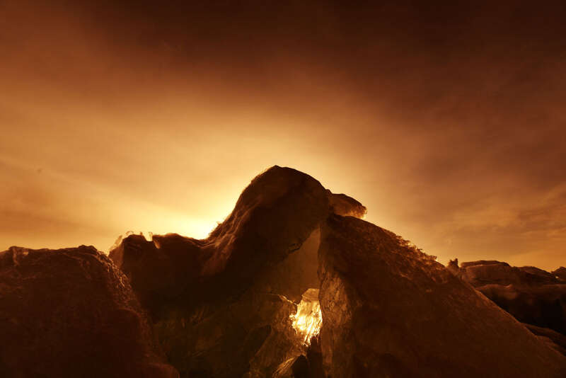 4月6日,赛里木湖畔的冰推在夕阳下散发着光芒。