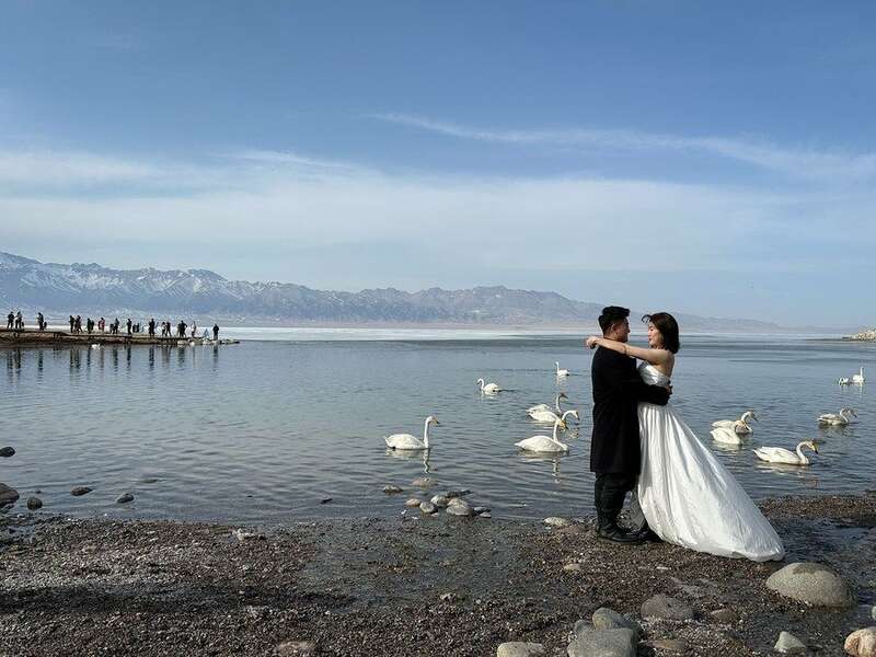 4月6日,一对情侣在赛里木湖畔拍摄婚纱照。