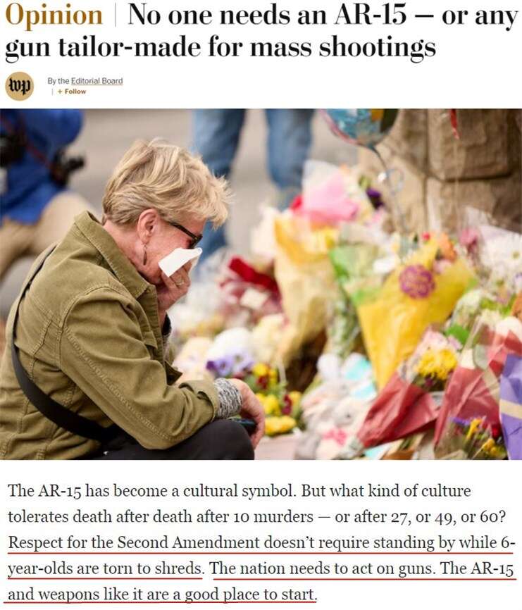 在美国近日连发大规模枪击事件后,《华盛顿邮报》以《没有人需要AR-15或任何为大规模枪击量身定制的枪支》为题发表社论慨叹,大规模枪击事件总是令人心痛,但无论是屠杀本身还是用来实施屠杀的武器,都已经不再令人惊讶。