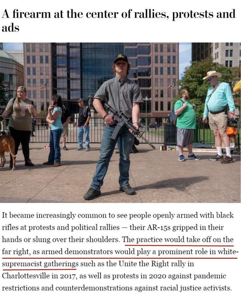 如今,AR-15在美国几乎无处不在,并日益演化成为一种“文化符号”。无论是在抗议活动还是政治集会上,以白人至上主义分子为代表的众多枪支拥护者公开携带AR-15步枪的场景变得越来越常见。