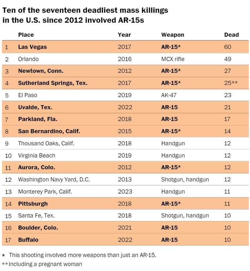 据《华盛顿邮报》最新统计,自2012年康涅狄格州纽敦市桑迪胡克小学枪击案至今,美国17起最致命的大规模枪击案中有10起涉及AR-15。