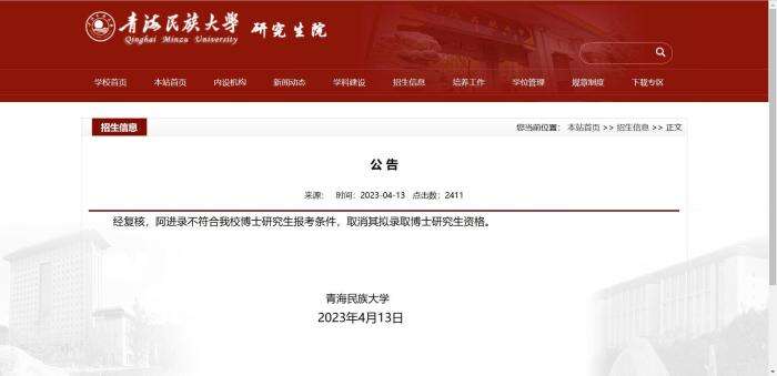 中新网西宁4月13日电 (胡贵龙 潘雨洁)青海民族大学研究生院官方网站13日发布最新信息称,“经复核,阿进录不符合我校博士研究生报考条件,取消其拟录取博士研究生资格。”
