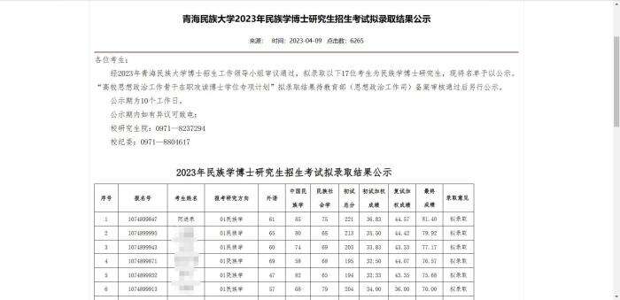 9日,青海民族大学研究生院官方网站发布《青海民族大学2023年民族学博士研究生招生考试拟录取结果公示》。该公示称,经2023年青海民族大学博士招生工作领导小组审议通过,拟录取17位考生为民族学博士研究生,其中,考生阿进录以最终成绩81.40分进入拟录取名单,在民族学(报考研究方向)拟录取的6名考生中排名第一。