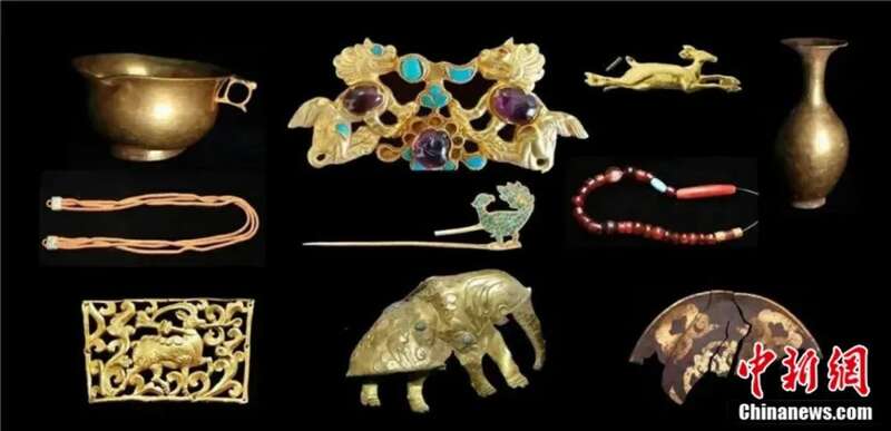 墓中出土的人首鱼尾纹金饰片,人物脖颈饰后方飘浮的绶带,都是典型的波斯萨珊王朝装饰纹样。