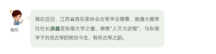 现场,洪晨以《琴操》《礼记》等古籍中的文字开篇,用甲骨文中“琴”字的书写方式和文物图片引入,为在场的同学们详细讲解了琴之起源、琴的构造、形制,感受古琴之古;再从了解古琴各大流派和梅庵琴派历史渊源,引导大家欣赏古琴艺术。《平沙落雁》《关山月》《风雷引》…… 洪晨现场演绎经典古琴曲目,探究古琴艺术对中国民族音乐的贡献。 洪晨表示,此次来到东南大学更是一次“寻根之旅”,今后将继续沿着古琴前辈的步伐,苦研琴艺,并将之发扬光大。