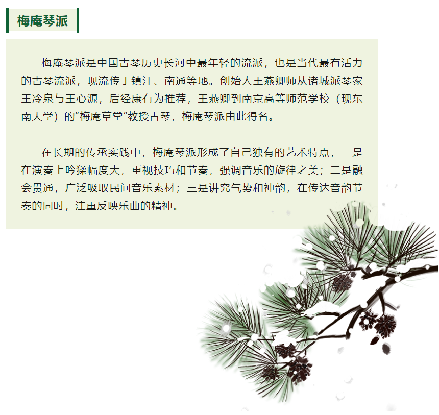 梅庵是梅庵派古琴艺术的发祥地 ,梅庵琴派创始者王燕卿在当时的南京高等师范学校“梅庵”设帐教授古琴,开古琴进高等院校之先河。