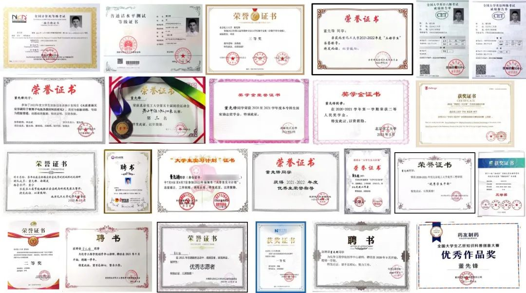 董先锋,中共党员,北京化工大学化学工程学院化学工程与工艺专业2020级本科生,本科前五学期综合排名1/246。现任北京化工大学国旗护卫队队长、校学风朋辈引领中心讲师、化工2005班班长等。曾获2021-2022学年国家奖学金、2020-2021学年国家励志奖学金,人民二等奖学金,素质拓展奖学金;积极参与学术科研,曾获全国高校计算机能力挑战赛国赛二等奖、“华教杯”全国大学生数学竞赛国赛三等奖、“挑战杯”首都大学生“揭榜挂帅”专项赛道市级三等奖、北京化工大学创新创业训练项目校级良好、国才杯英语阅读大赛校级三等奖等奖项;积极参与志愿服务,累计志愿时长达600余小时。先后获评北京化工大学优秀本科生、三好学生、优秀团员、军训标兵、十佳社团负责人、化学工程学院优秀学生干部、十佳学风先进个人、优秀志愿者等荣誉。
