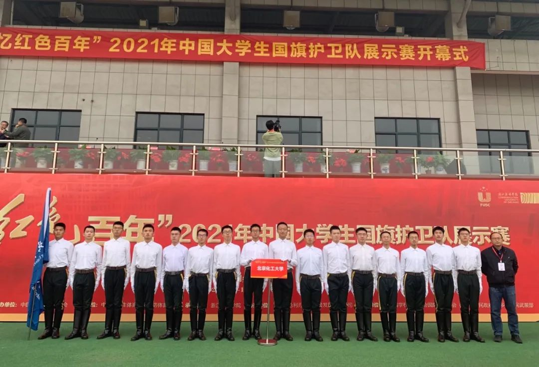 带队参加全国高校国旗护卫队展示赛,左四为受访者
