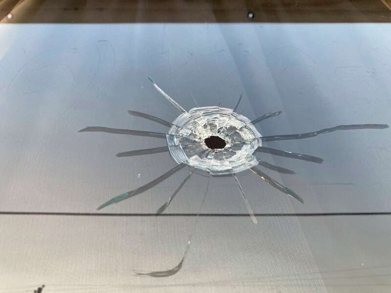 这是4月16日在美国亚拉巴马州戴德维尔枪击事件现场拍摄的弹孔。美国东南部亚拉巴马州小城戴德维尔15日晚发生枪击事件,造成4人死亡、28人受伤。新华社/美联