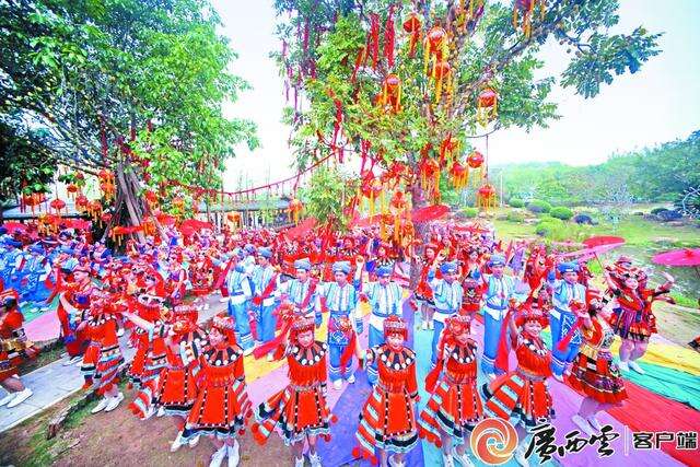 “齐唱山歌敬亲人,铜鼓声响幸福来,五色香囊挂起来,开启如意聚福幡,感恩父母感恩党……”一首《迎宾歌》敬亲人,迎接客人一起参加欢乐庄重的传统壮族婚礼。“新人碰蛋福相连,缔结良缘好梦圆,相濡以沫到白头。”在壮族《出嫁歌》欢快的歌声中,一对新人带领全体宾客走进一场民族风情浓郁的盛宴。由200多名各族歌手组成的山歌方阵,举起手中的绣球,在连心树下唱起节奏明快的山歌,用歌声表达热情的欢迎,抒发无尽的欢欣。