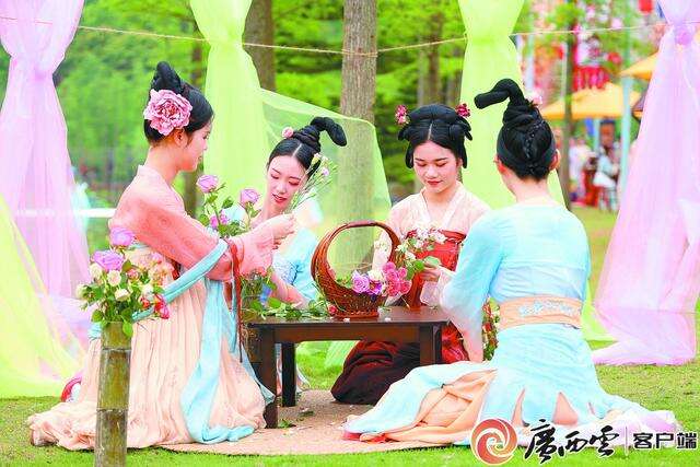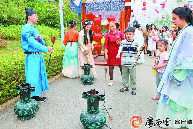 在“古风雅集”起始处,长髯先生在教一群垂髫童子“三月三”习俗,带领游客体验古人“插柳”祈福活动,一束柳枝,将“壮族三月三”与“上巳节”这一中华民族共同的文化记忆连接起来。