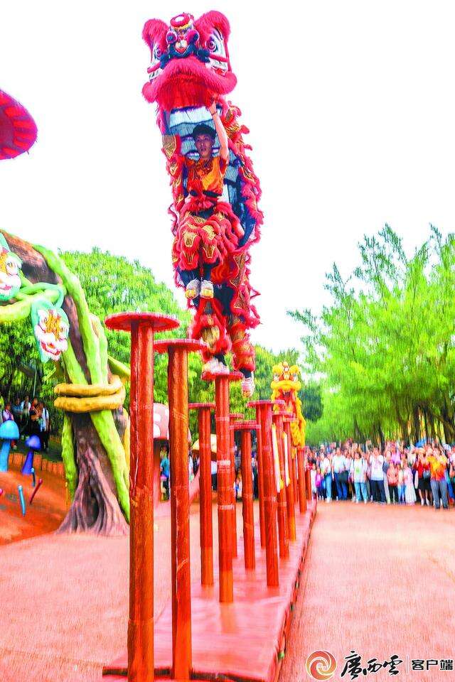 一声锣鼓响,雄狮飞起来。伴随着强劲的鼓点,来自梧州藤县的醒狮在高低错落的桩上攀高跳跃、腾转挪移,以技术和美感俱佳的狮舞喜迎各地宾朋共度佳节。