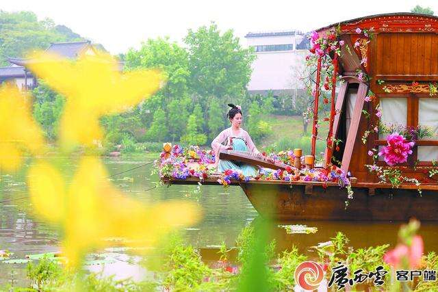 “暮春元日,阳气清明。祁祁甘雨,膏泽流盈”,如此良辰美景,正是文人雅士集会水滨,吟诗作文的盛日。在湖岸边一处美景当中,文人墨客临水设席,弹琴弈棋,吟诗作画,数不尽的风流倜傥;而距岸边不远的水面上,有一方水上舞台,一群妙龄女子霓裳羽衣、态浓意远,再现“长安水边多丽人”的胜景。