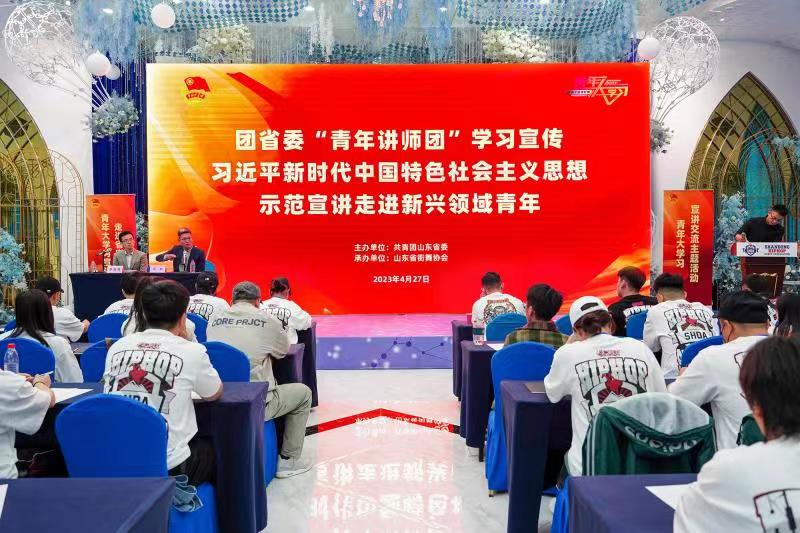 中国青年报客户端讯(中青报·中青网记者 邢婷)4月27日上午,团山东省委“青年讲师团”学习宣传习近平新时代中国特色社会主义思想示范宣讲走进新兴领域青年活动在济南举办。该活动由共青团山东省委主办、山东省街舞协会承办,旨在深入学习贯彻习近平新时代中国特色社会主义思想和党的二十大精神,切实发挥“青年讲师团”理论轻骑兵的作用,深入推进党的创新理论“青年化”阐释。