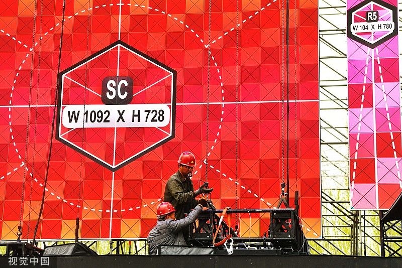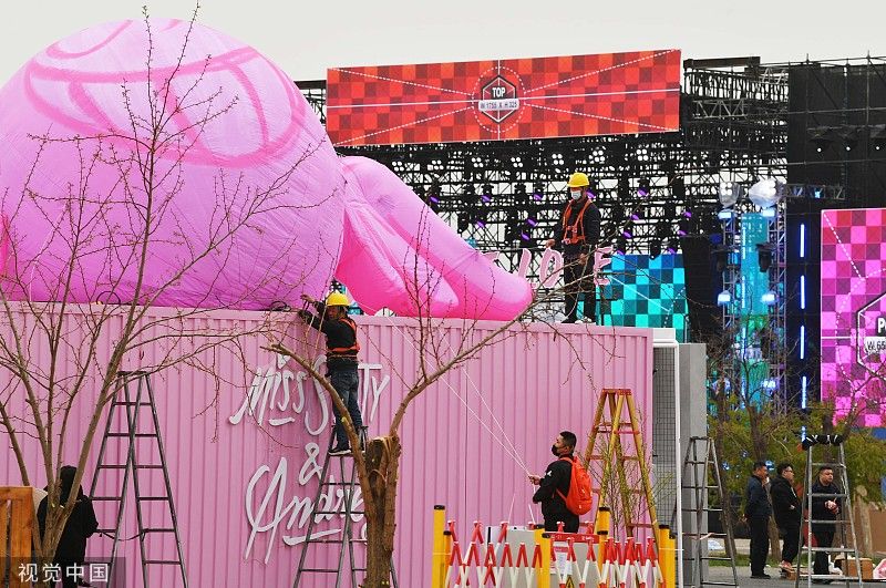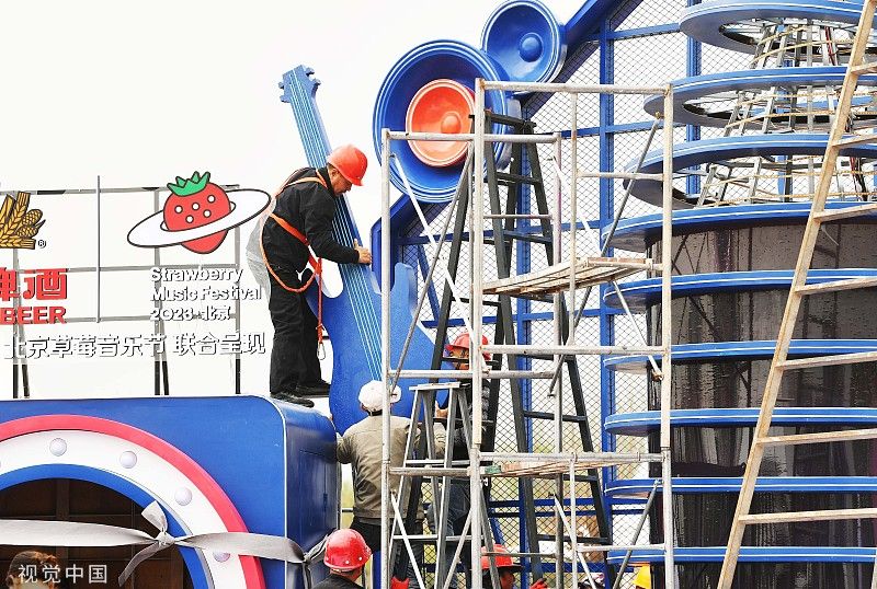 4月27日,北京,草莓音乐节舞台已搭建完毕。 2023北京草莓音乐节即将于“五一”假期在北京世园公园飞行营地上演。据现场工作人员介绍,本届草莓音乐节共有66组艺人参演,从经典乐队到知名唱作人,从摇滚、独立流行到电子,风格多元化。 下午15时,天空下着淅淅沥沥的小雨,北京延庆世园公园飞行营地里,北京草莓音乐节现场,草莓舞台、爱舞台、星球舞台已经搭建完毕,工作人员正在对音响设备进行调试。其他一些配套的服务设施正在紧张搭建中。