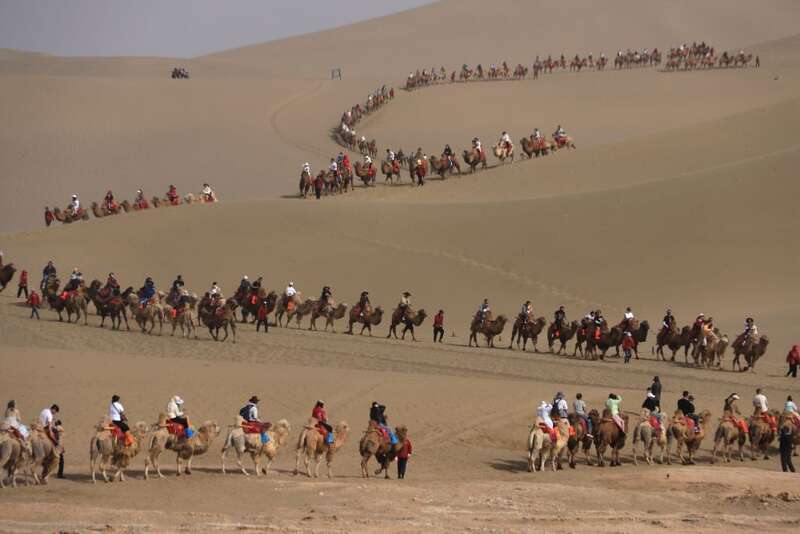“2400多峰骆驼全部‘上岗’,从早到晚忙不过来!原本40分钟的路程现在要走1小时左右。”敦煌鸣沙山月牙泉景区负责人说。