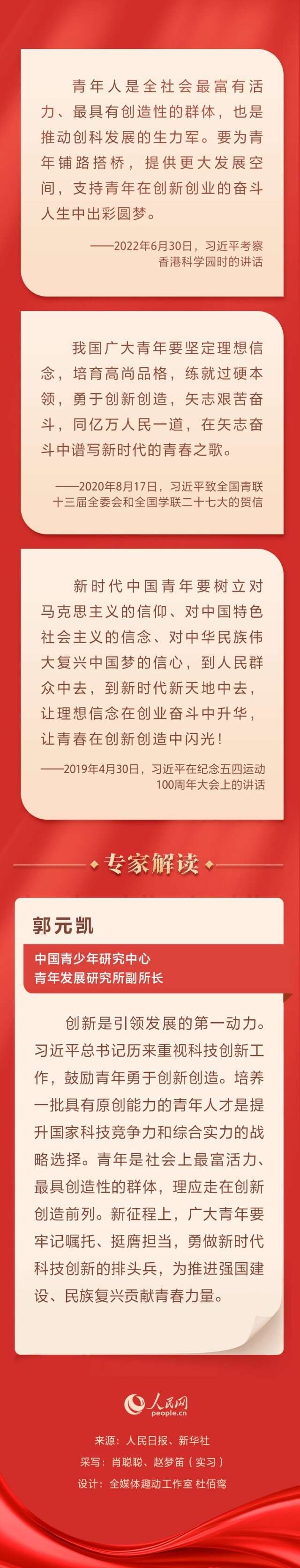 “青年是祖国的前途、民族的希望、创新的未来。”一直以来,中共中央总书记、国家主席、中央军委主席习近平鼓励青年追求梦想,让青春在创新创造中闪光。人民网邀请专家进行解读。